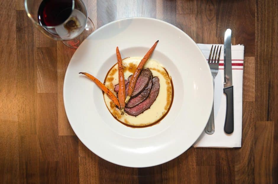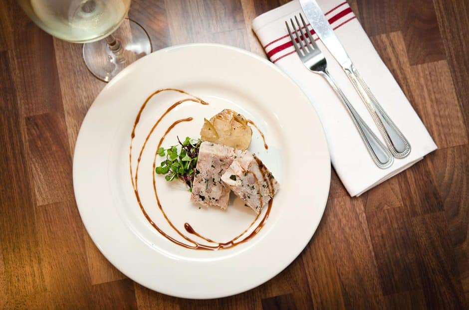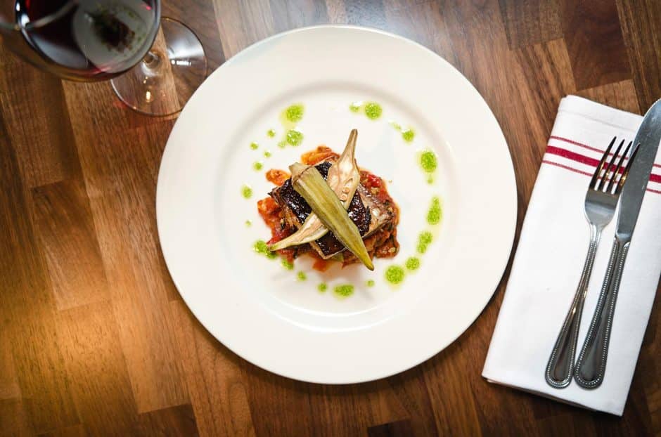 Pepper Jelly Glazed Pork Belly with Field Peas, Spring Vegetable Ratatouille, Fried Plantain, Whipped Feta, and Pan Reduction