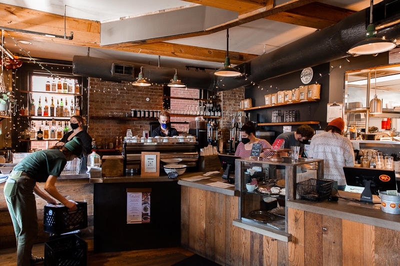 Dining In: At Frothy Monkey in Downtown Franklin, guests are welcome to dine-in with full-service wait staff at indoor tables and on the porch. Please see the host stand to be seated.