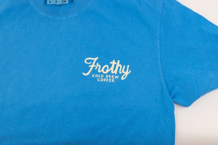 Cold brew season calls for the perfect tee, and this one delivers. We put our hand-drawn “Frothy Cold Brew Coffee” script on the front left chest and our full cold brew can illustration on the back.