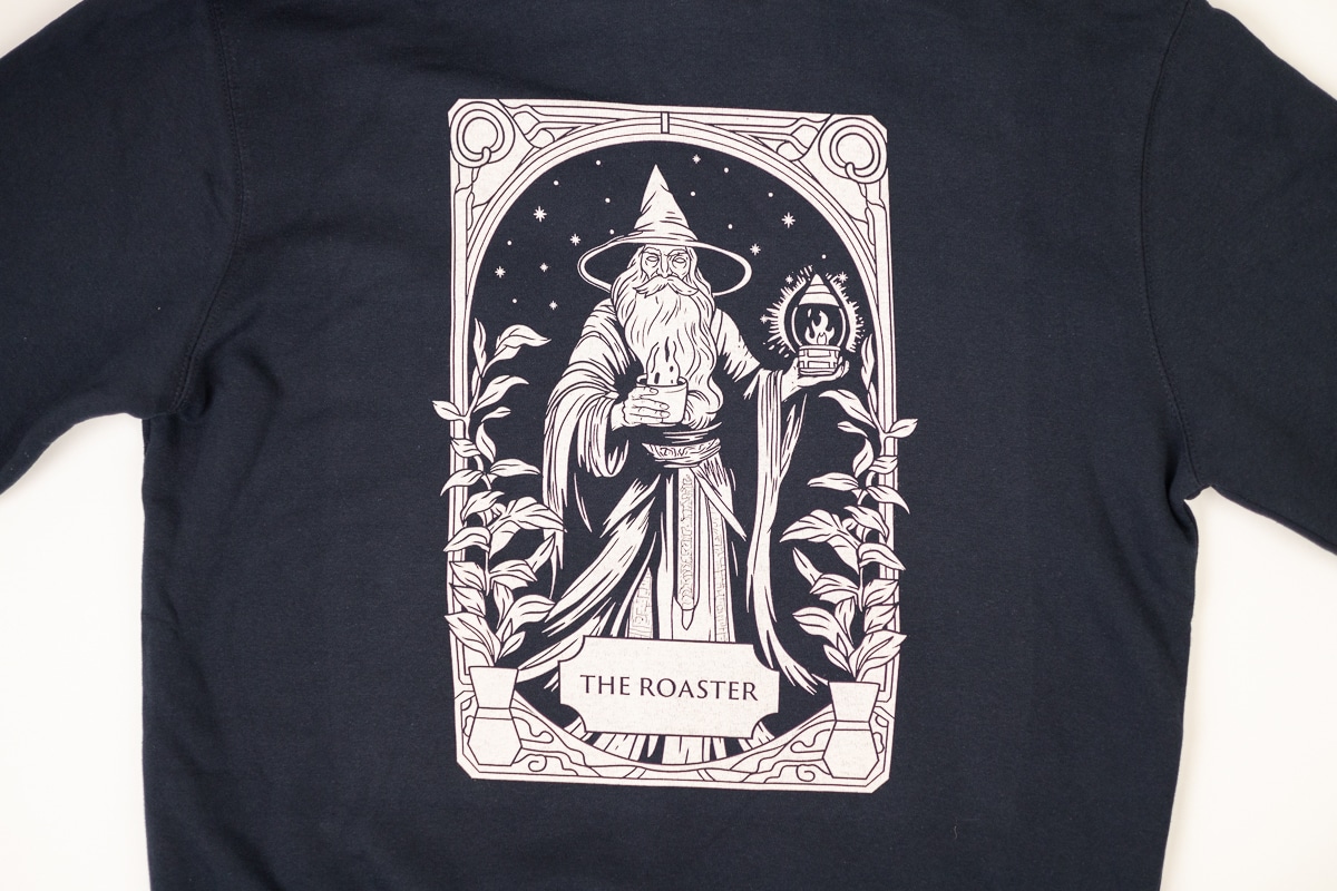Our Fall/Winter 2024 hoodie combines style and sustainability, featuring a minimalist ‘Frothy Monkey’ front print and a unique ‘The Roaster’ tarot-inspired back illustration. Crafted from eco-friendly materials with a generous, comfortable fit, this navy hoodie offers exceptional comfort for both lounging and outdoor wear while maintaining a commitment to environmental responsibility.