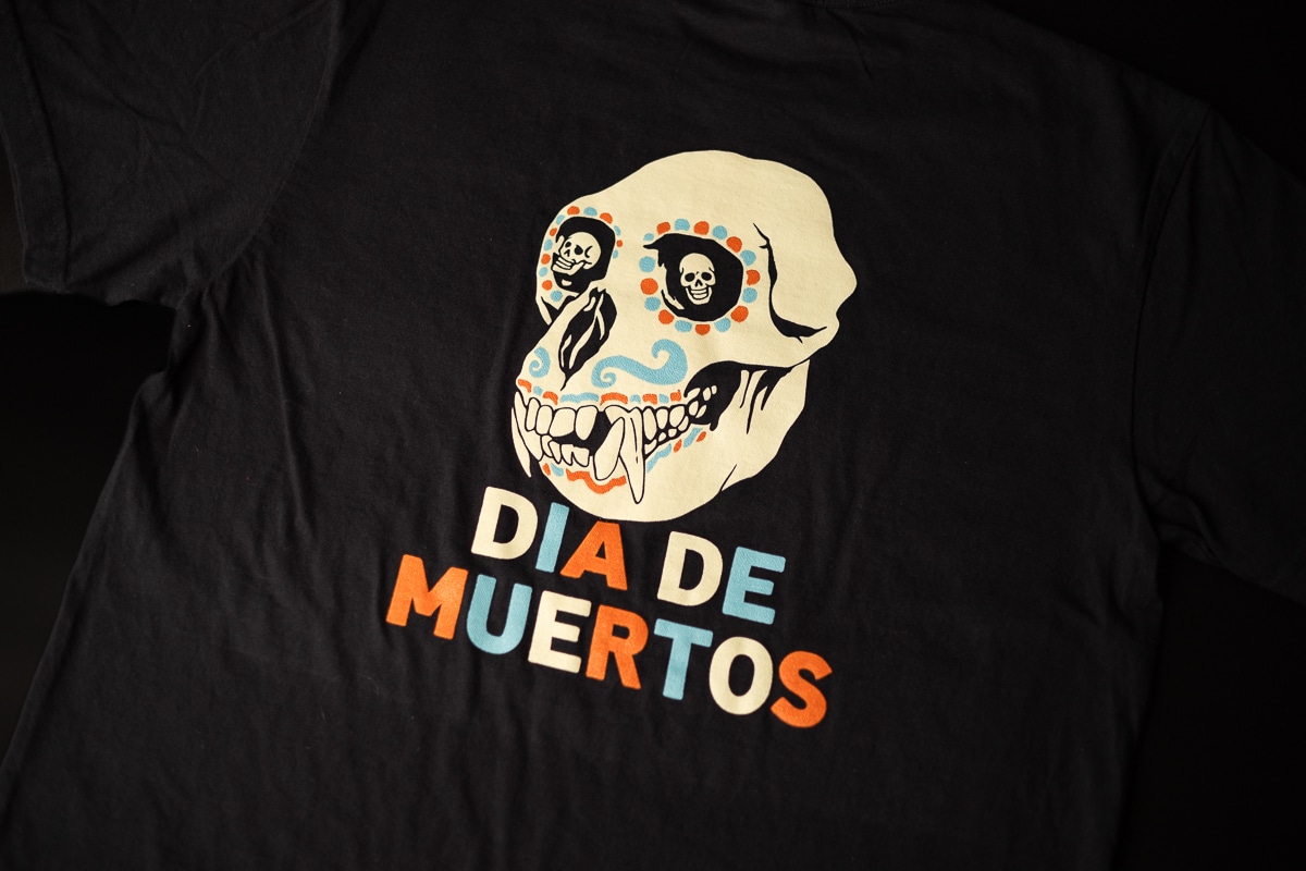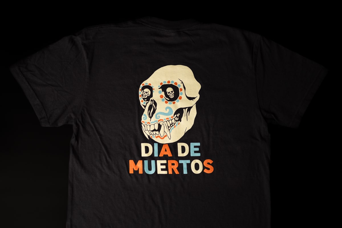 These tees feature a front left chest and back print of our Frothy Monkey Día de Muertos Monkey Skull. Available for a limited time!