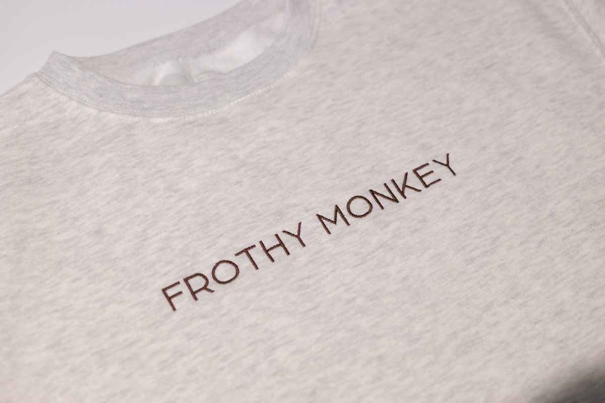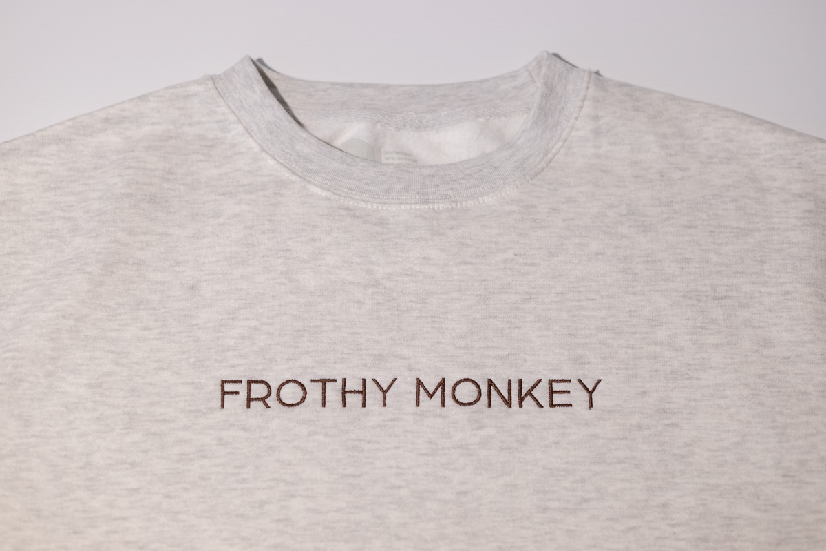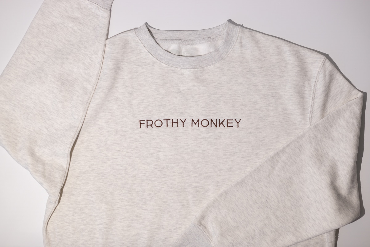 Fresh for Fall / Winter 2023 comes our comfiest sweatshirt yet! Once you put one on you won’t want to take it off. These oatmeal heather crewneck sweatshirts are sized for a generous fit and feature FROTHY MONKEY embroidered on the front chest in brown thread.