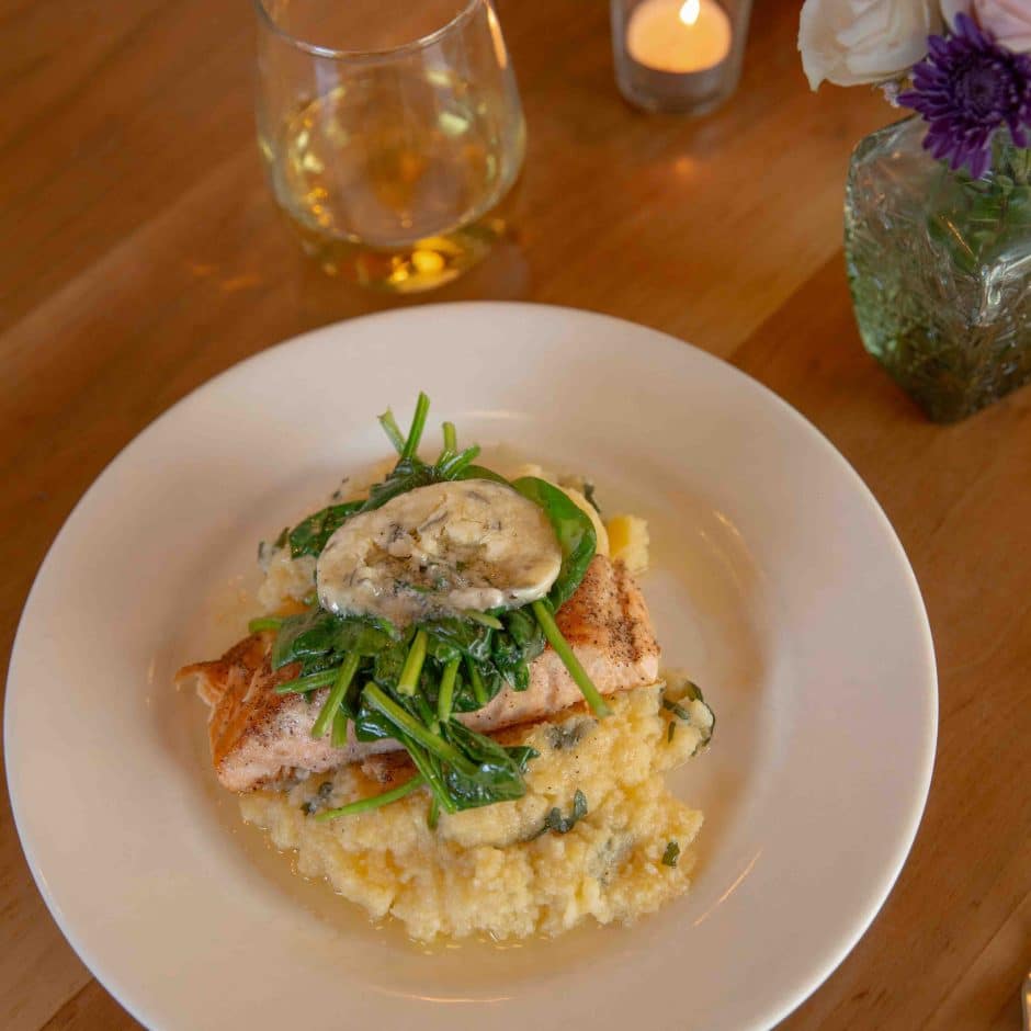 Pan Seared Salmon | over Parmesan Herb Polenta, Garlic Buttered Spinach and Lemon Sage Butter