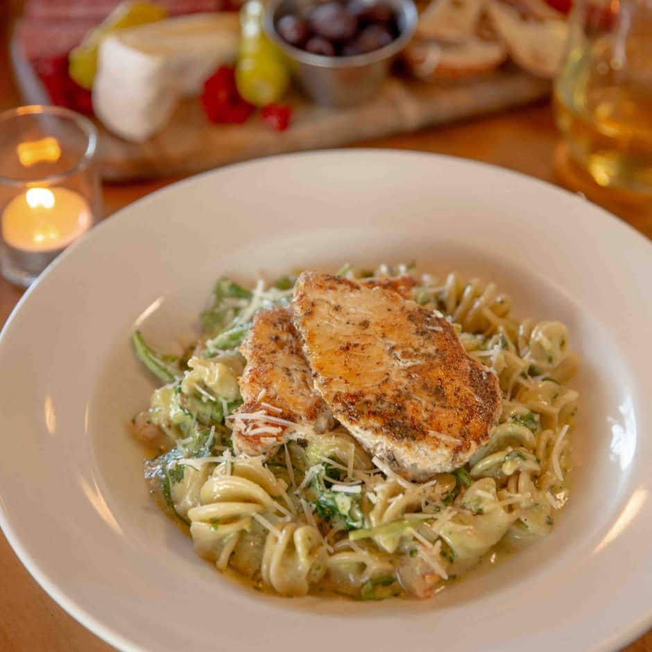 Grilled Chicken and Creamy Basil Pesto Pasta | Nicoletto’s (Nashville, TN) Fusilli Pasta with Grilled Chicken Breast, Tomatoes, Mushroom, Arugula and a Basil-Garlic Pesto Cream