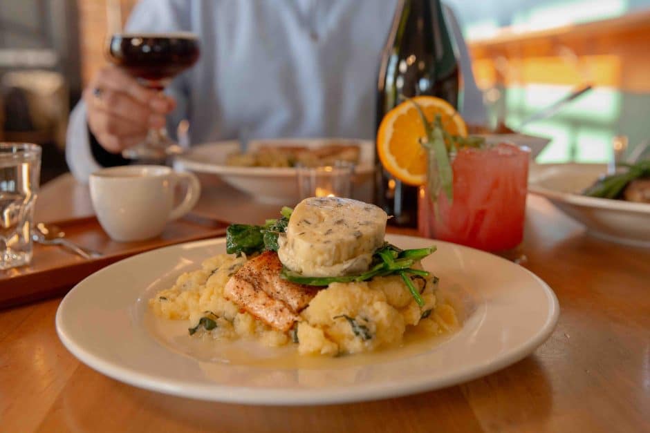 Next, dive into your main entree. You’ll choose between Braised Lamb Osso Bucco, Pan Seared Salmon, or Grilled Chicken and Creamy Basil Pesto Pasta for your entrees.