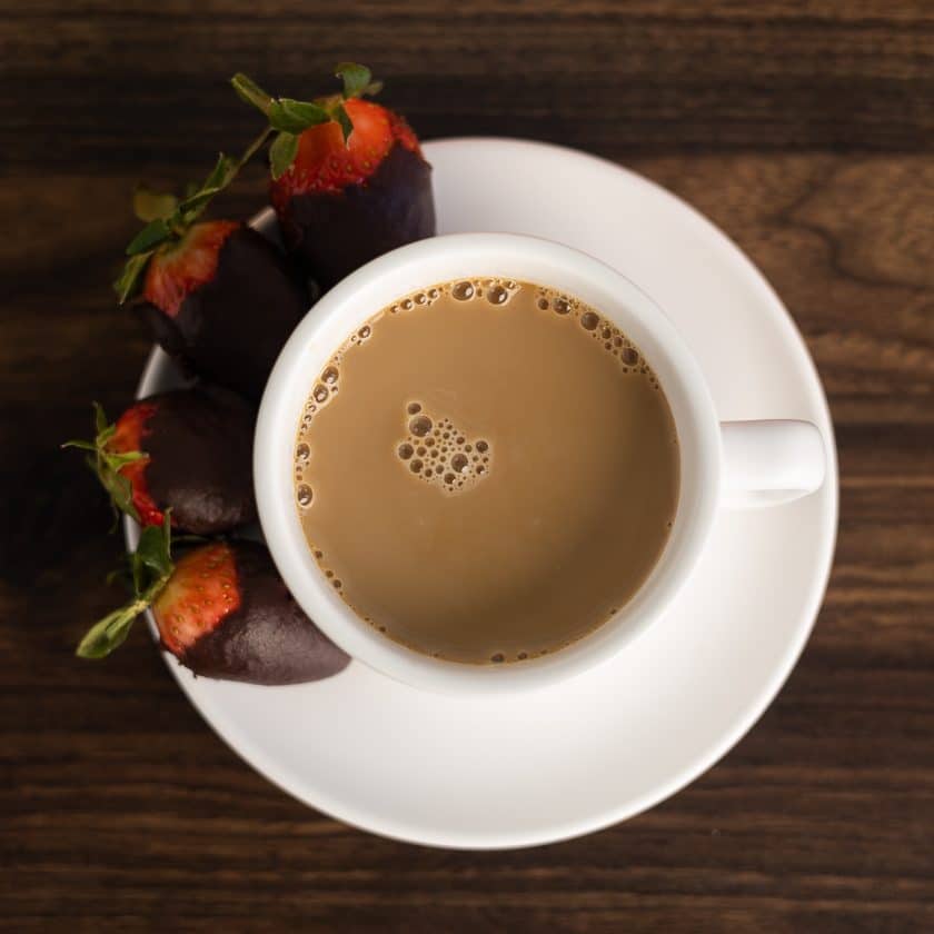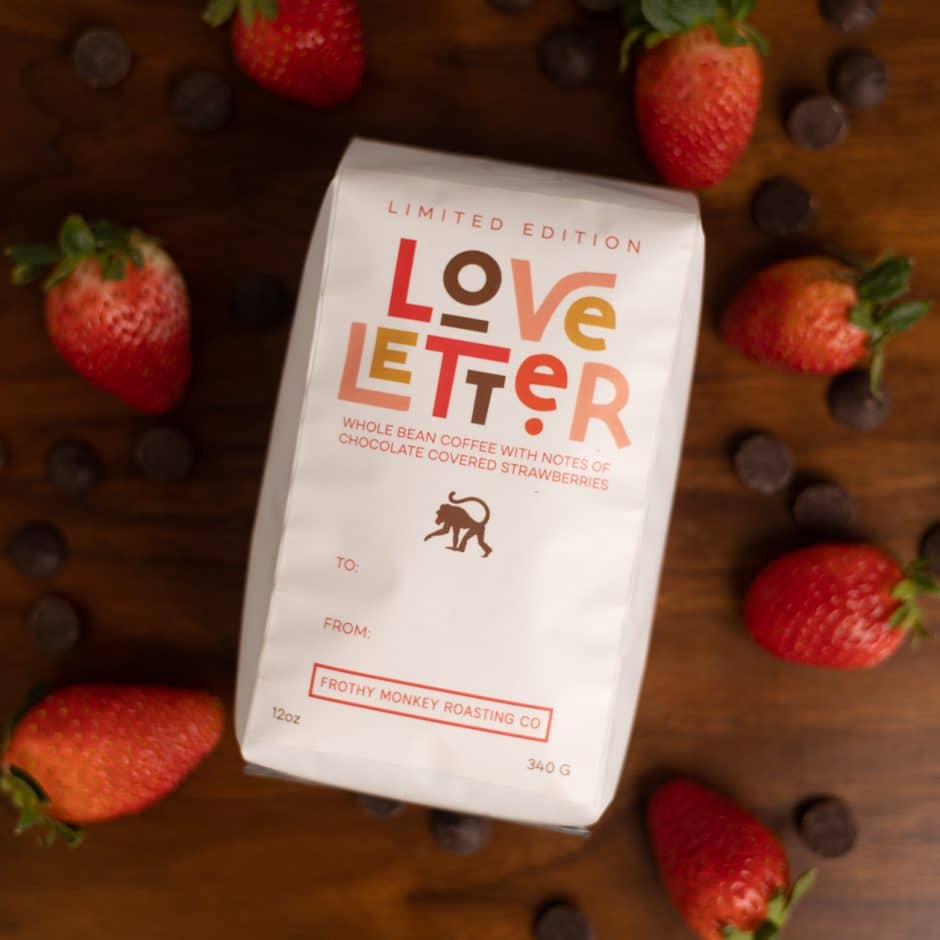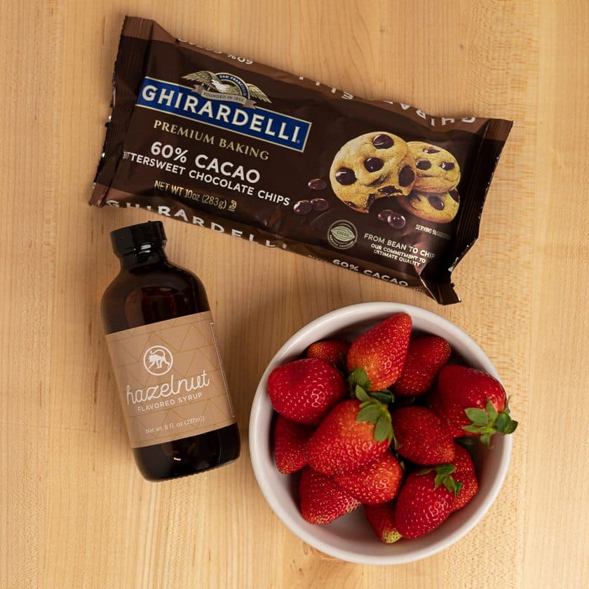 Our seasonal coffee, Love Letter has tasting notes of chocolate-covered strawberries, and this got us thinking about what flavor may even enhance the ol’ chocolate-covered strawberry. Enter Frothy Monkey Hazelnut Syrup! It reminds us of Nutella, but fresher! Using just 3 ingredients, this recipe will wow anyone you serve it to, and they’ll have no idea how easy it is! – until you share this with them;-)