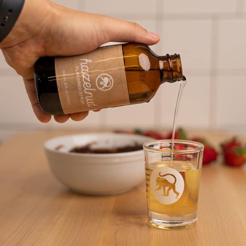 Measure out 3 oz of Frothy Monkey Hazelnut Syrup. Stir together until smooth.