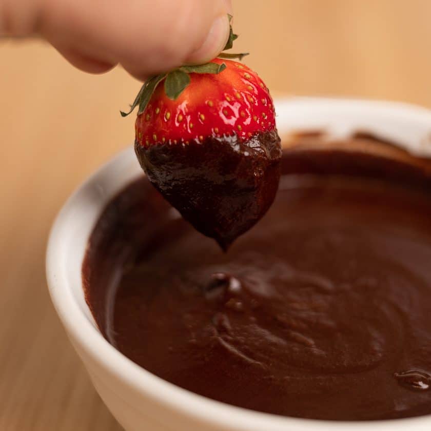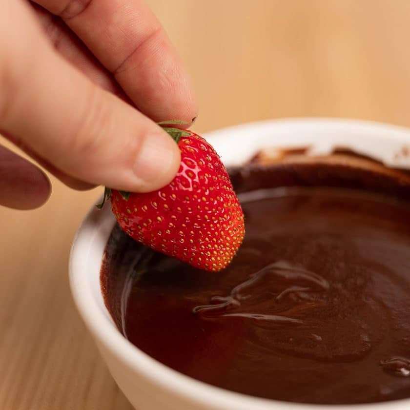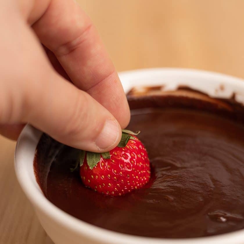 Step 4 – Dip the strawberries in hazelnut & chocolate sauce