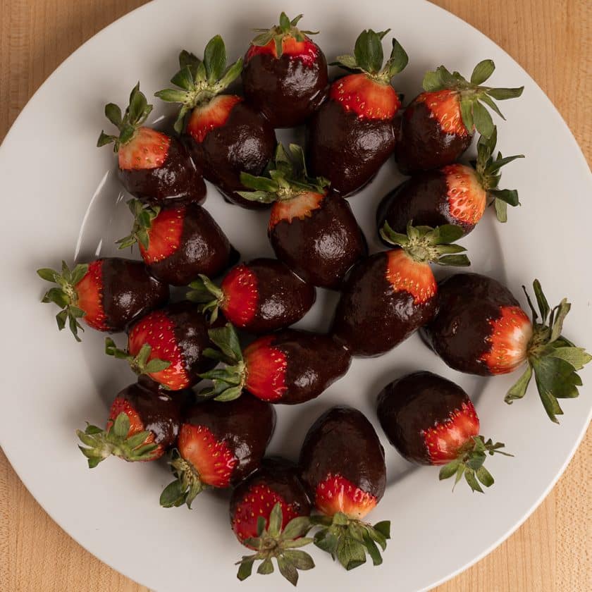 Store your chocolate-covered strawberries in a cool location and allow the chocolate to harden. Want to speed up the process? Place your plate or baking sheet (with parchment paper) in a refrigerator for 20 to 30 minutes or until the chocolate is no longer dripping.